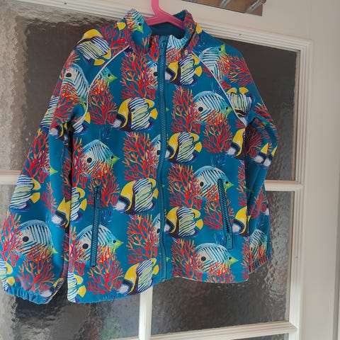 Myytävänä kaunis vadelmanpunainen Color Kids softshelltakki. Hyvin heijastimia. Ei enää uudenveroinen, mutta yleisilmeeltään minusta siisti. Taskun yläreunassa jokin tumma tahra, josta kuva.