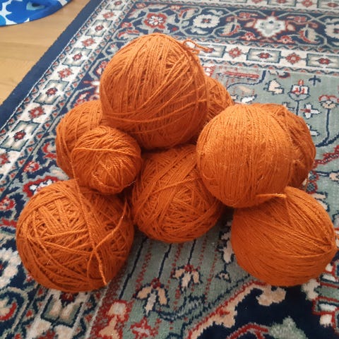 7veljestä villalanka. Lila hieman ohuempaa lankaa, näkyy puikonvaihdit koko m 8e.