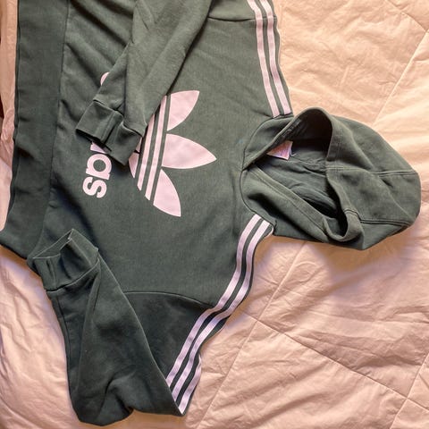 Adidas huppari, koko 152cm. Tahra (kuulakärkikynästä) takana. Hinta 3€