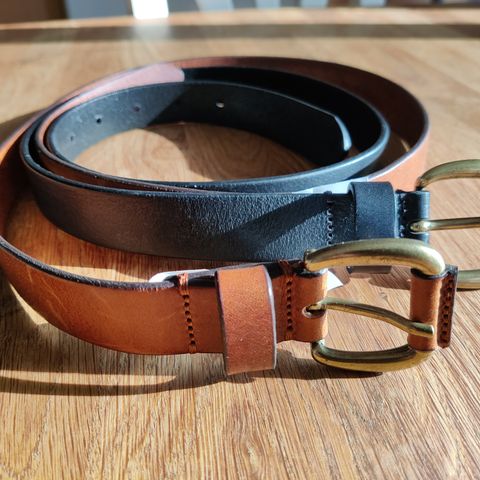 Kulta/musta. Nahkaa. Kokonaispituus 94cm. Säädöt: 72cm/75cm/77cm/80cm/82cm.