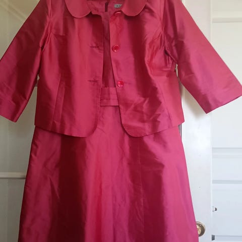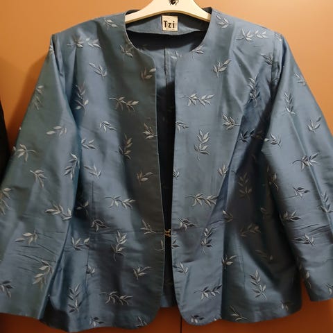 Tummansininen lyhythihainen Marnie West silkkitakki, koristebrodeerauksia edessä, koko XL, vyö puuttuu. 100% pure silk. Kaikai 59 cm.