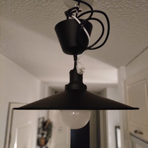 Mitat n. leveys 73 cm, syvyys n. 30 cm. Kattokupu ja metalliketju n. 40 cm eli ei tule kauhean alas. Sähköjohtoa kyllä riittää pidemmällekin. Pistokekiinnitys kattoon.