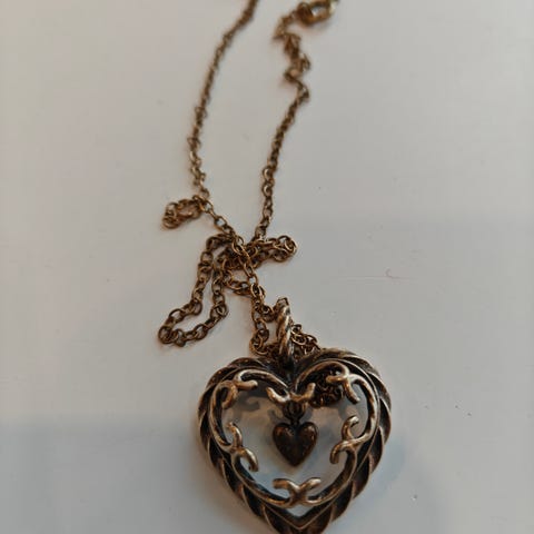 Kalevalan hopeinen Talon sydän -riipus ja kaulaketju. Hieman tummunut, mutta ehjä ketju ja riipus.