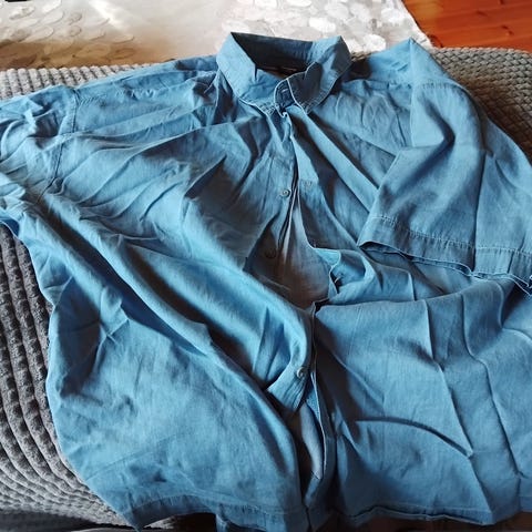 1) sininen, kaksi rintataskua joissa nappi taskun läpässä . Lyhyet hihat.