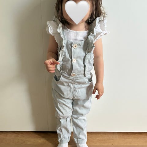 Nopsupopsun, nykyisen Noelle Designin, nätit frillalappuhaalarit kokoa 86/92, muutaman kerran päällä olleet, erittäin siistit laadukkaasta kankaasta, ei juuri moitteita. Henkseleissä kolmen nepparin säätövara ja lahkeissa reilut resorit. Vaaleanpunaiset ihanat henkselipöksyt.