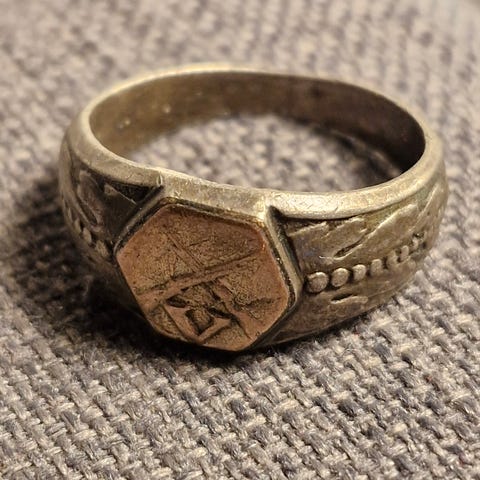 Sota-ajan sormus, sormuksen sisällä lentokoneen kuva. Luultavasti valmistettu lentokonemetallista sodan aikana luppoaikana