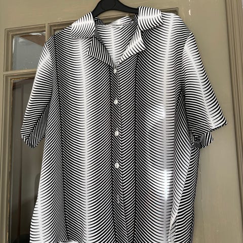 Musta, Ewi polyesterisatiini vintagepaita, valmistaja Ewald oy Lahti Finland, koko 38. Kaula-aukossa nappi, jonka alta poistettu vuorikangasta eli käyttö vain nappi kiinni.