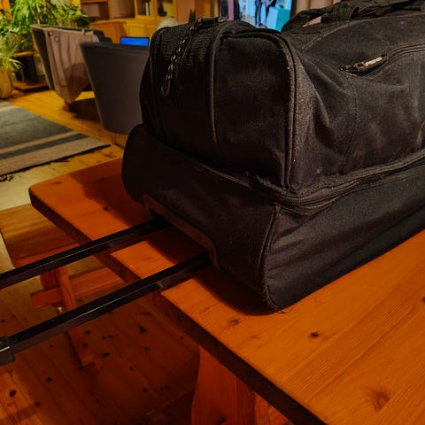 Myydään toimiva ja tilava vetolaukku.Etutaskusta puuttuu vetoketjun sulkija.Muuten täysin ehjä.