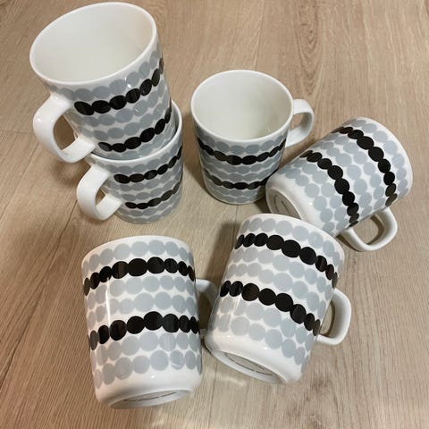 Marimekon Siirtolapuutarha kahvikuppeja (2,5dl) viisi kappaletta. Värinä beige-musta, poistunut tuotannosta ja tätä ei saa enää kaupoista ostettua.