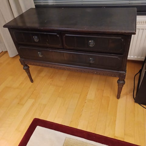 Alkuperäinen täyspuinen senkki jossa pieni vitriini keskellä ja kaapit sivuilla.p.140×k83×s49.Entisöimällä siitä saa kuin uuden.
