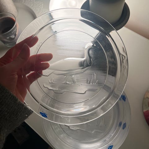 Nuutajärven Vintage pitsireunaiset kirkkaat lautaset, halkaisija 14 cm.