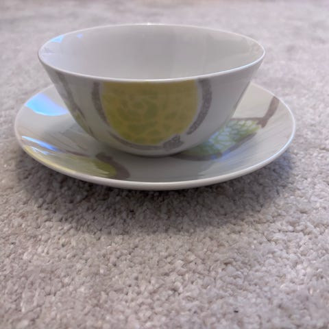 Ehjä, hyvä ja siisti kunto. Kakkulautasissa hieman käytön jälkiä.