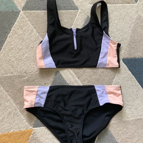 Lasten bikinit tytöille, koko 146. Setti sisältää kaksi erilaista bikinitoppia ja kaksi erilaista bikinihousua. Bikinit ovat moniväriset, joissa on raidat ja vihreitä lehtikuvioita. Sopii tytöille kesäkäyttöön.