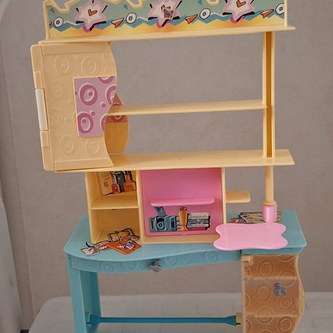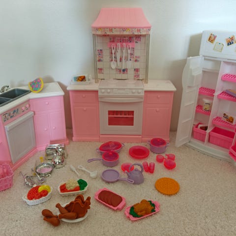 Barbie ruokapöytä setti 90's, pöytä taso käännettävä, toisella puolella peili. Pöydässä kellertymää, muuten siisti. Yksi ruoka ja kaksi aterinta puuttuu.