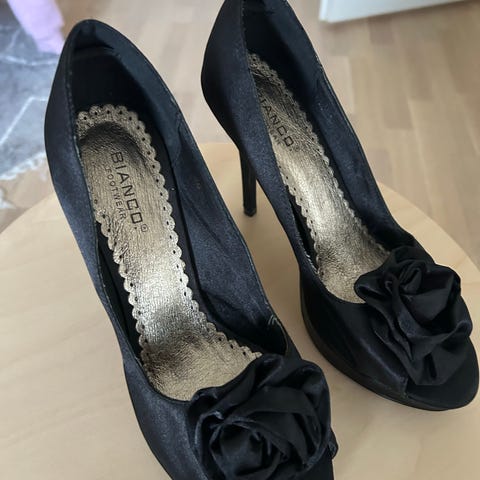 Biancon korkokengät, koko 38. Koron korkeus 10 cm. Hyvässä kunnossa. Mukana käyttämättömät varakorkolaput. Materiaali tekstiiliä.