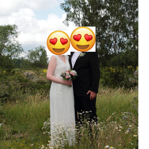 Swarovski häämekko. Mahtuu raskausmahan kanssa (kuvassa rv 39+5). Koko n. 36-38. Takana nyörit. 167cm pituisella, ilman korkoja. Ostettu käytettynä ja ompelija tehnyt muutokset: nyöritys lyhennetty ja olkaimet lisätty.