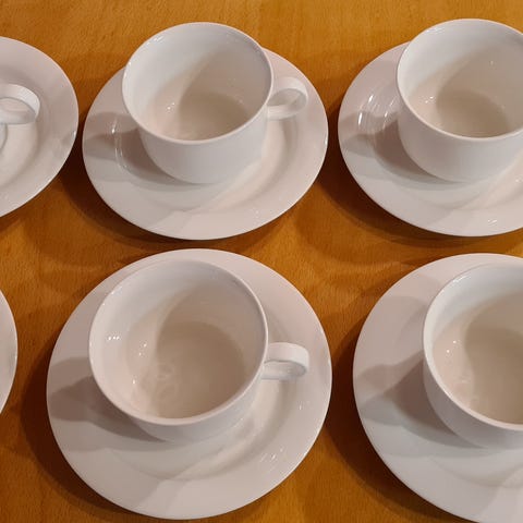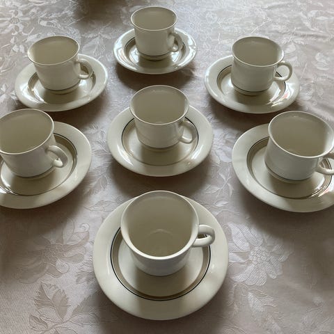 Esteri Tomulan suunnittelema koristeaihe Arctica-sarjan teekuppiin. Myynnissä on 4 kpl teekuppia ja aluslautasta. Kupin korkeus 6,5 cm ja halkaisija 9,5 cm, aluslautasen halkaisija 16 cm. Kaikki ovat oikein hyvässä kunnossa ja täysin ehjiä, vain vähäisessä käytössä olleita. Hinta on kaikkien 4 teekupin ja aluslautasen yhteishinta.