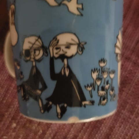 Myydään muumimuki Rauha 0,3dl. Ollut käytössä muiden mukien rinnalla varmasti vuosikymmenen ja sittemmin käyttämättömänä säilössä toisen samanmoisen.