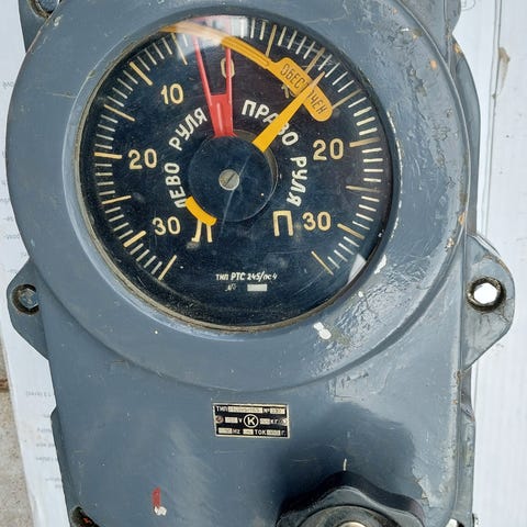The down and up the diving position of the meterfrom from Soviet union submarine Whiskey Class, Projekt 613, built 1952-1958.. Aito alkuperäinen todella harvinainen löydetty 1953 valmistetusta Neuvostoliittolaisesta romutettavasta sukellusveneestä jotka olivat kuin kokoluokkansa U-sukellusveneen kopioita. Ennen romutusta olisi tällaiset laitteet pitänyt poistaa, tai tuhota kiinni ollessaan, ei tehty, ehkä liikaa vodkaa mukana työssä.
