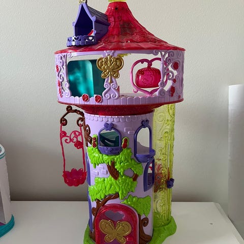Torniin saa valot, jos laittaa nappipatterit paikoilleen. Valo menee päälle "taika toiminnolla" eli puhaltamalla siihen. Meillä tätä ei ole kokeiltu, mutta paketissa on ohjeet. Tornissa on keinu ja hissi, sekä ylimmässä kerroksessa pyörivä lattian osa. Mukana tulevista pienistä tavaroista on pari kappaletta kadonnut. Olen pussittanut tallella olevat tavarat.