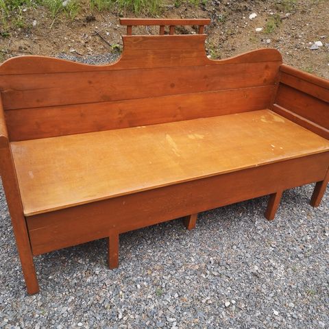 Ikean puinen penkki. Säilytystilaa kannen alla. Pituus 173cm, syvyys 52cm ja korkeus selkänojaan asti 87cm. Vain haku.