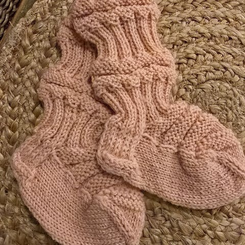 Vauvojen/lasten junasukat. Lahjapaketissa. Uudet villasukat käsinkudotut. Nalle langasta. Pohjan pituus 13cm. N. 9-14kk.