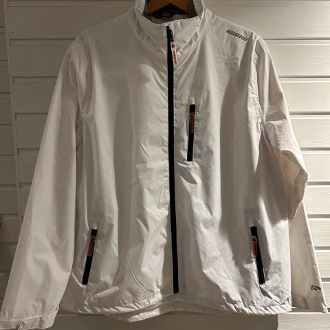 Karhun valkoinen, kevyt tuulitakki. Kokomerkintä 160 cm. Mielestäni reilua mitoitusta.