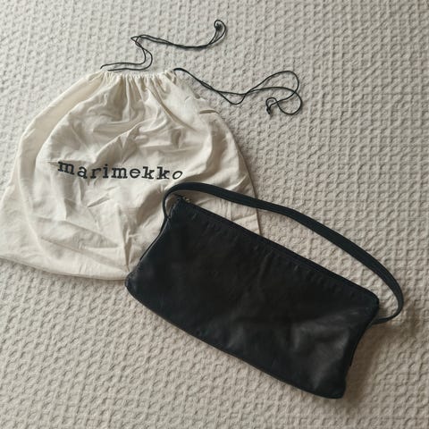 Ritva Fallan Marimekolle suunnittelema (y2k) nahkainen pikkulaukku, kaupunkilaukku, pussilaukku. Laukun sisällä pienempi vetoketju pussukka arvotavaroille. Nouto Alppiharjudta taikka R-pussilla postit 6€.