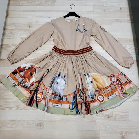 Ihana Molon pitkähihainen hevosaiheinen mekko koko 146/152, mekkoa on käytetty max 3 kertaa, vähän ryppyinen. Nouto tai posti. En tee toridiiliä.