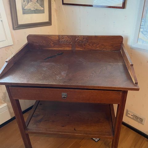 Upea jugend tammipöytä, halkaisija 90 cm, Kork 74 cm. Jalan alaosassa kuparpakotuksia.