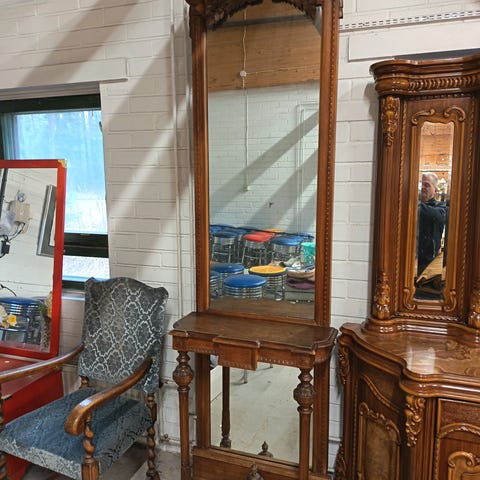 Noin 100 vuotta vanha peilipöytä. Pöydässä pieni vedettävä laatikko.