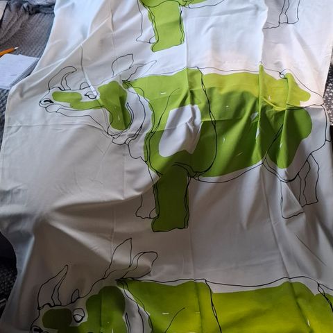 Myydään ihana Valillan valmisverhot Reino sarvi, jossa sarvikuonon ääriviivat mustalla, valkoinen pohja ja keltaista.