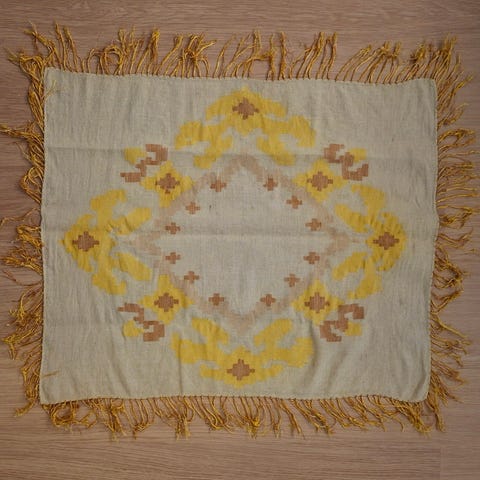 Kangas kai 70 luvulta. Pöytäliina 85x155 ja pussukka narulla 56x42. Yht. 25e. Vähän kangas haalistunut.