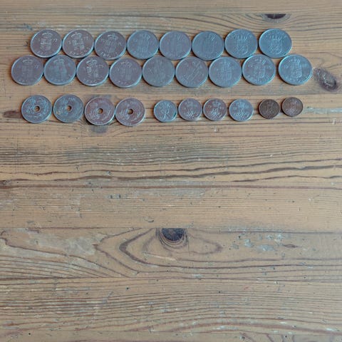 Ruotsin/Tanskankruunuja kolmekymmenen euron edestä.