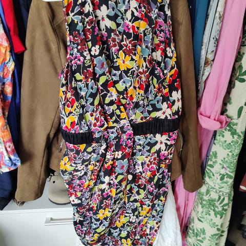 Tara Jarmon mekko, uusi koko 42, kainalo-kainalo noin 49 cm ja pituus noin 84 cm, rimpsu helma, takana 3 nappia, materiaali 100% polyester.