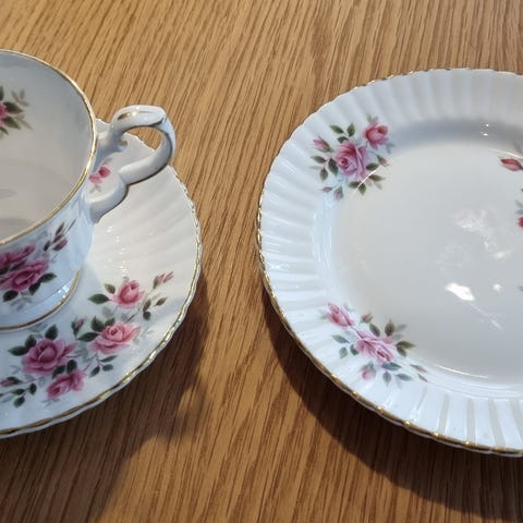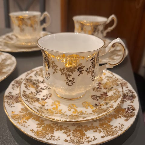 Juhlavat valkoiset "Royal Standard Fine bone China England" kahvikuppeja pullalautasineen, yht. 5kpl.
