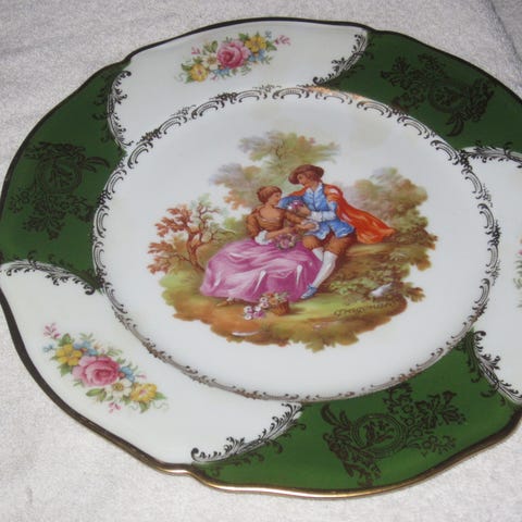 Limoges seinälautanen koristelautanen 21cm vihreä valk. kullattu(?) pariskunta