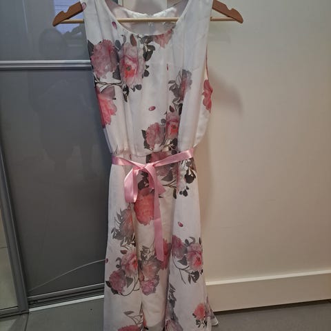 Tästä mekko häihin,morsiusneidoksi,koulun juhliin tai ihan mihin vaan.Koko lapussa 160cm,mutta ehkä suosittelisin vähän pienemmälle.Todella kaunis liehuva.Oikea prinsessa mekko.