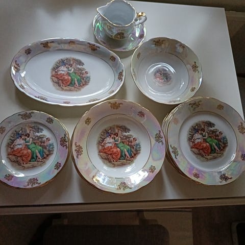 Myynnissä keittokulho, kastikekaadin x 2 alkuruokalautasia x 12 (halk. 19cm), pullalautasia x 5 (halk. 16cm), tarjoilulautanen x 1 (halk. 30cm), salaattikulho (halk. 25cm) ja kolme kokoa soikeita paistilautasia.