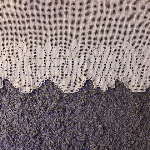 Luonnonvalkoinen, käsin virkattu kalastajalangasta, pituus 275 cm, korkeus n. 20 cm