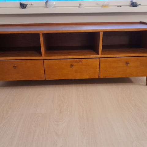 TV-taso puuviilupintaisella ruskealla viimeistelyllä. Tasossa on kaksi alaspäin avautuvaa kaappia reunoilla ja lasinen avohylly keskellä, jossa on myös läpivienti johdoille. Taustalevyssä on aukko kaapeleiden siistiä läpivientiä varten. Soveltuu televisiolle ja mediavälineiden säilytykseen olohuoneessa tai muussa asuintilassa.