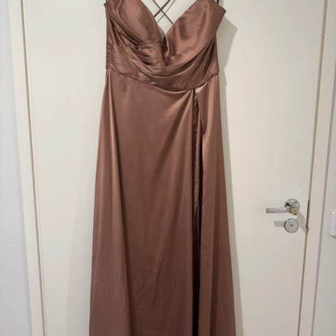 Tummanruskea, kerran käytetty silkkinen iltapuku. Kaunis, klassinen leikkaus. Koko US 12/n.42