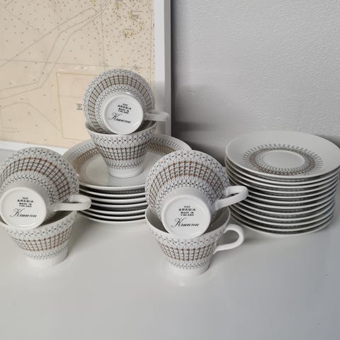 Lähes käyttämätön isoäitini pyhäastiasto. Syviä lautasia 8 kpl, matalia 13 kpl, halkaisijat 23 cm. Tarjoilukulhoja 2 kpl, 22 ja 27 cm, ja tarjoilulautasia 2 kpl, 27 ja 36 cm. Soppakulho 22,5 cm. Kaksi kaadinta, 16 ja 18 cm. TEE ASIALLINEN TARJOUS!!