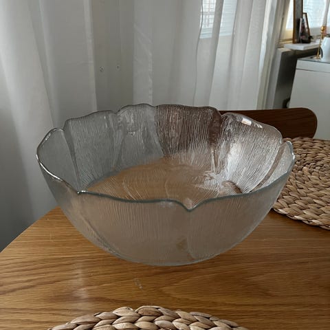 Lasinen kulho, halkaisija 21 cm, korkeus 11 cm, vähän käytetty. Vain nouto.