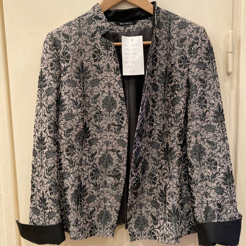 Eila Helenin klassikkojakku. Koko 34. 100 % silkkiä. Monivärikuvioitu kangas. Upea juhlajakku. Edestä avoin, napiton. Siksi kokoaan tilavamman tuntuinen. Olka-helmapituus n. 49 cm. Hihat käännettävissä 3/4-pituisiksi, jolloin boleromainen. Käyttämätön,