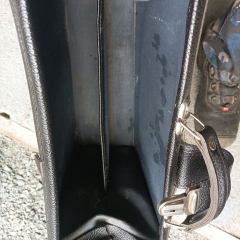 Nahkainen, vanha salkku, koko n. 43 x 30 cm. Sisäosan pikkuosaston vetoketju ei toimine, hakasia puuttuu (ks. 4. kuva).