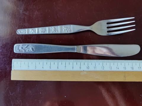 Tarjolla kuvan mukaiset, käytössä olleet, mutta edelleen käyttökelpoiset haarukka ja veitsi lapselle.