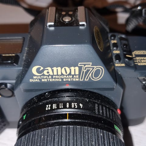 Koko setti : Canon T 70 + objektiivit Tefnon 35-80mm, Tefnon 80-205mm, Tamron teleconcerter 2X - salama Canon 277T + kameralaukku. Kameraa käytetty viimeksi n. 25v sitten