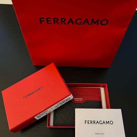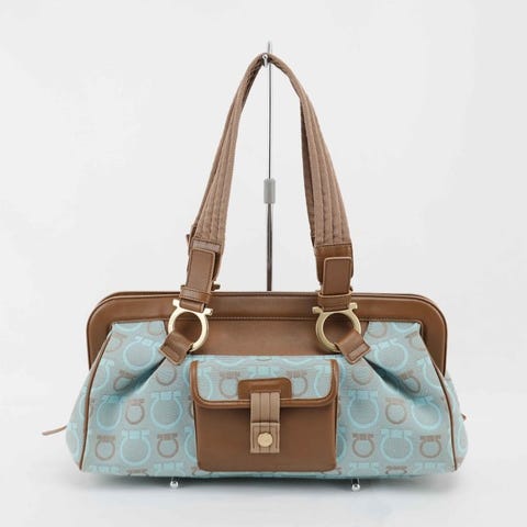 erittäin vähän käytetty italialainen aito Salvatore Ferragamo laukku. Materiaali musta ripsikangas ja kiiltonahka. Molemmilla puolilla sivuilla kaksi poikittaista laskosta. Kantokahva ja pohja kiiltonahkaa. Suljetaan vetoketjulla, Sisällä vetoketjulla suljettava tasku, Vuori mustaa Ferragamo logokuosista kangasta, Leveys pohjan reunassa 34 cm, kapenee hiukan yläreunaan. Korkeus 17 cm. Pohjan syvyys 12 cm. Kantokahvan pituus 55 cm.