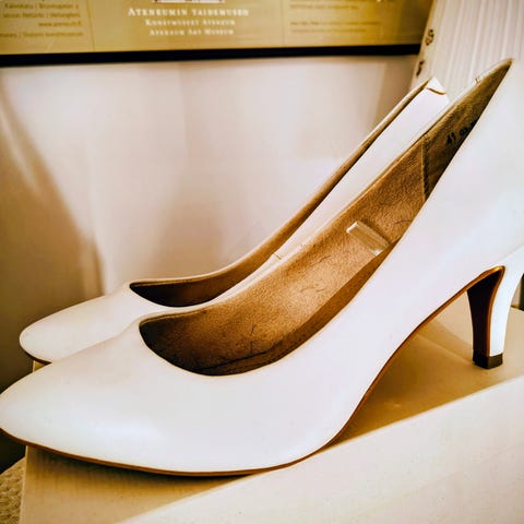 Hyväkuntoinen korkokengät, korossa on vikaa (kuvassa). Kengät ovat aitoa nahkaa.
